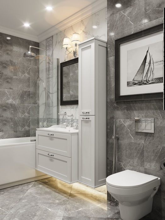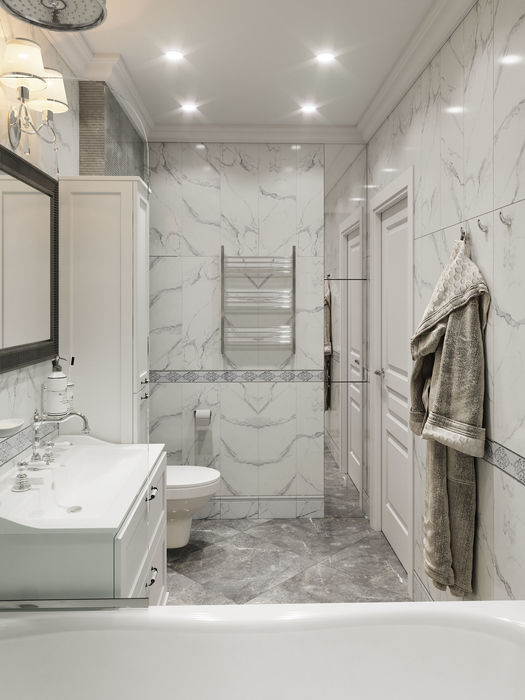 Мастер-ванная является неким продолжением главной спальни. Она выполнена в традиционных светлых тонах, а атмосфера располагает к релаксации и отдыху. Светлый мрамор в сочетании с серой плиткой нескольких оттенков смотрится неброско и благородно.