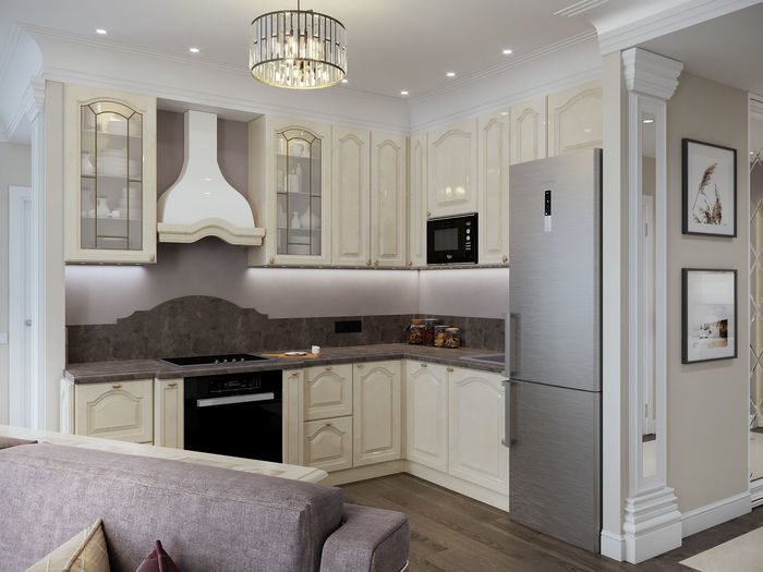 Эту кухню-гостиную мы создали в пудровых оттенках, полностью отвечающих стилистике всей квартиры. В зоне отдыха расставлены цветовые акценты — кресло и подушки, обитые бархатом винного цвета. Зонирование организовано с помощью правильно расставленной мебели — столовой группы и диванной; гостиную украшает камин. Текстиль для штор мы подбирали в также классическом стиле, но без излишней вычурности, поэтому он так идеально вписался в интерьер. Вечерами этот уголок дома становится центром сосредоточения всех домашних. Кухонный гарнитур, столовая группа, роскошный стеллаж для посуды и даже журнальный столик образуют великолепный ансамбль классической мебели, который дополняют мои любимые итальянские люстры из хрусталя.