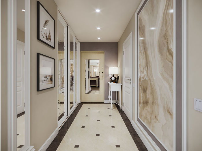 Холл мы наполнили белоснежными резными молдингами, моим авторским панно из мрамора и зеркалами с фацетами. Это безусловная классика, но в современном прочтении — именно то, что просили заказчики.