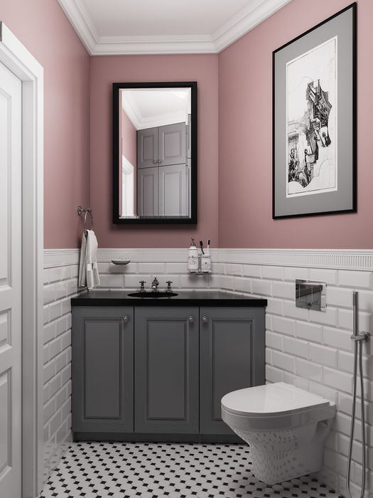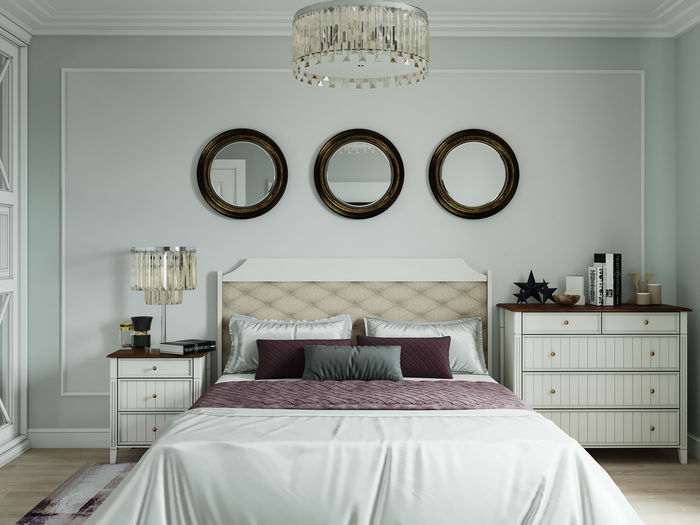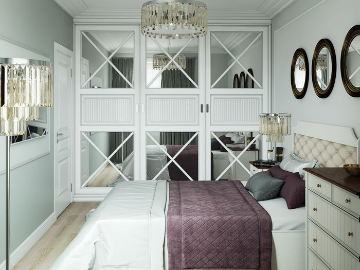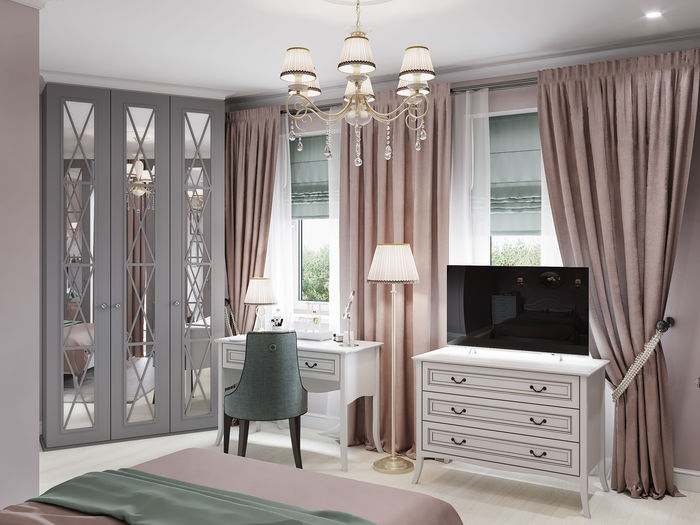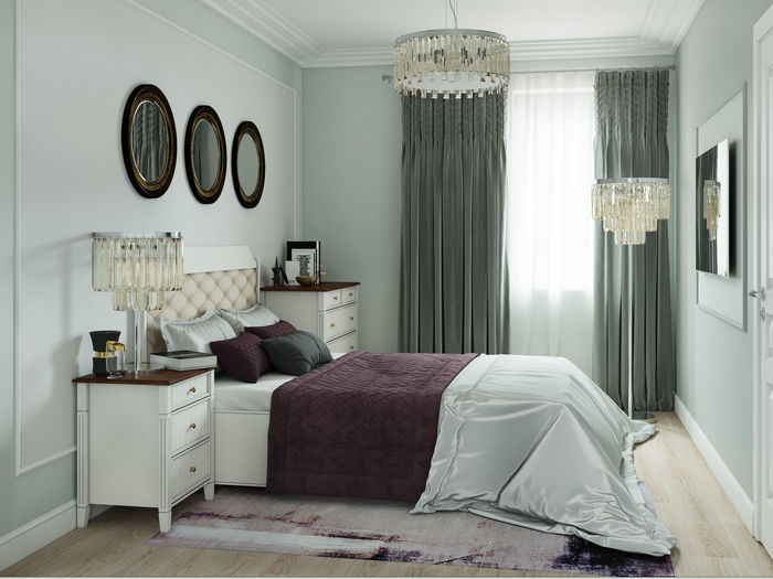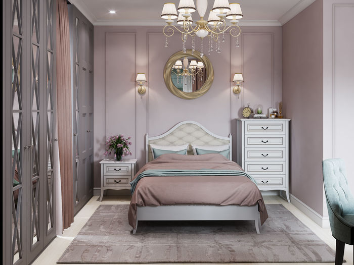 Особенностью этой квартиры стал выбор цветовой гаммы — каждая из комнат сосредоточила в своем дизайне один из пудровых тонов. Для мужской спальни выбор пал на приглушенный цвет мяты в сочетании с акцентами Шампань, искрящимися в хрустале светильников, и нежными оттенками брусники, окропившими часть текстиля. Остальные неотъемлемые детали классического интерьера, объемные молдинги и плинтус, резные фасады мебели и дверь, выполнены в традиционном белом цвете.
